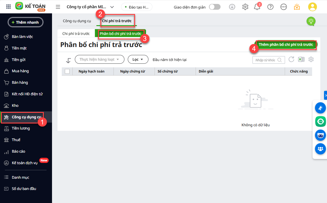 Bước 1: Tại phân hệ Công cụ dụng cụ\ tab Chi phí trả trước\ tab Phân bổ chi phí trả trước\Thêm phân bổ chi phí trả trước