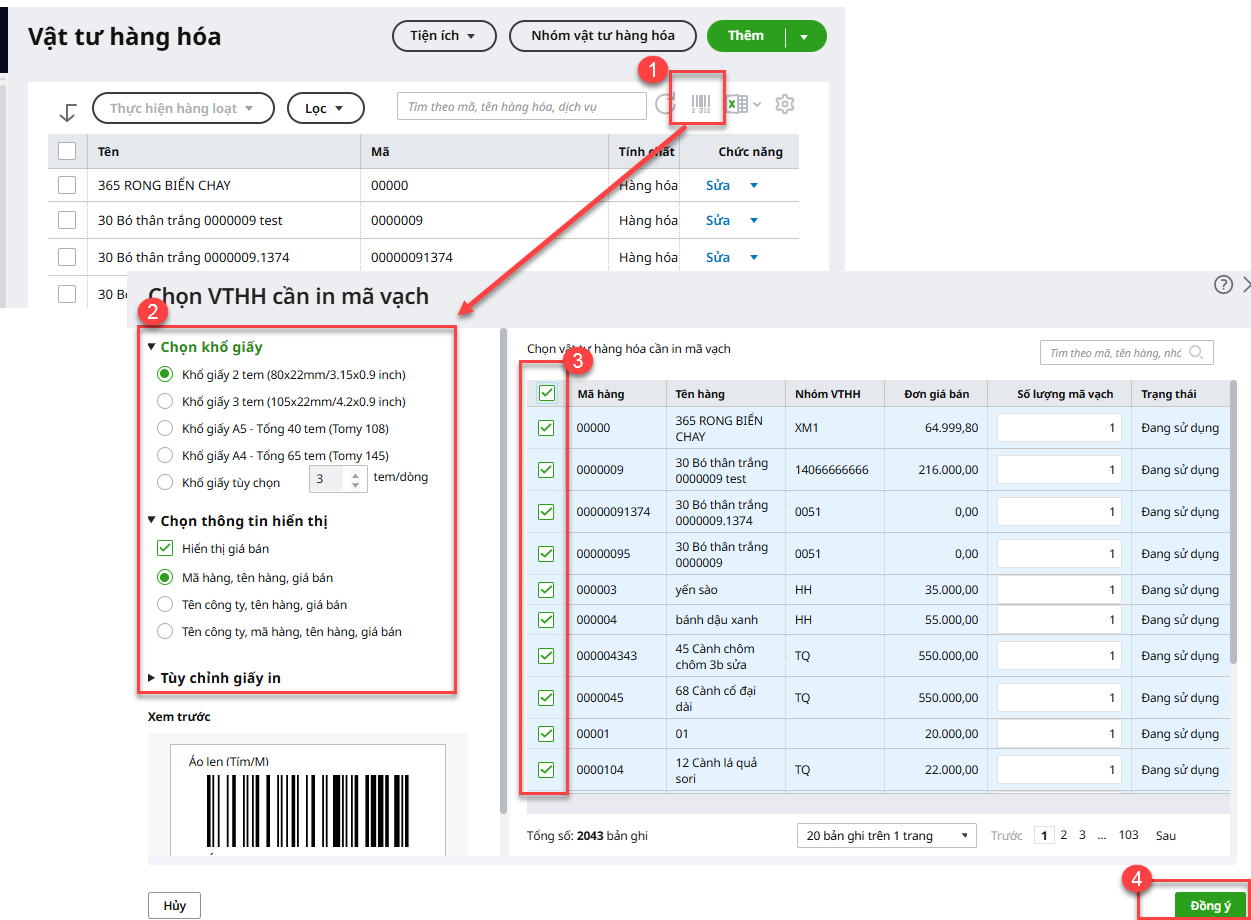 - Anh/chị có thể xem trước thông tin mã vạch để tùy chỉnh thêm cho phù hợp sau đó tích chọn các mã hàng vẫn in và nhấn Đồng ý.