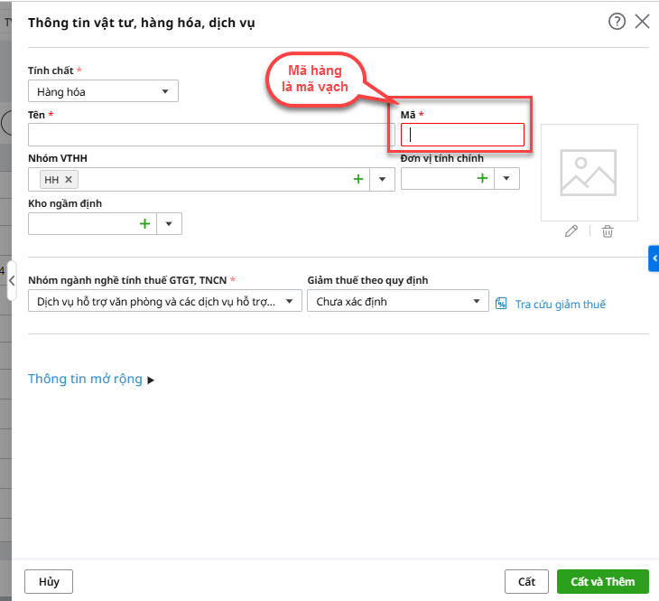 - Trường hợp sản phẩm có sẵn mã vạch mà anh/chị muốn sử dụng luôn mã này thì thông tin Mã hàng gõ là mã vạch của sản phẩm.
