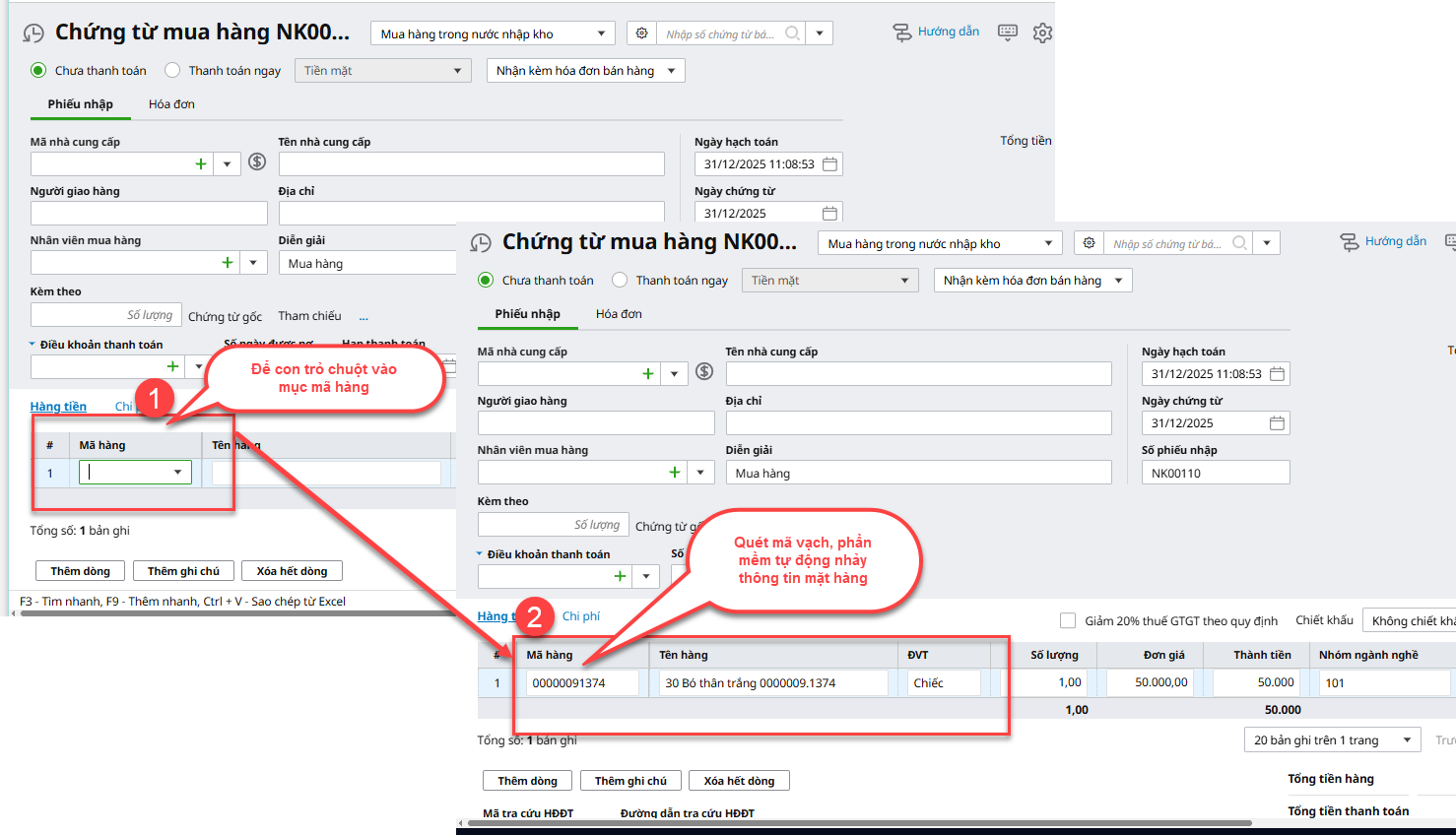 - Anh/chị để con trỏ chuột tại ô mã hàng sau đó dùng máy quét quét mã vạch của hàng hóa.