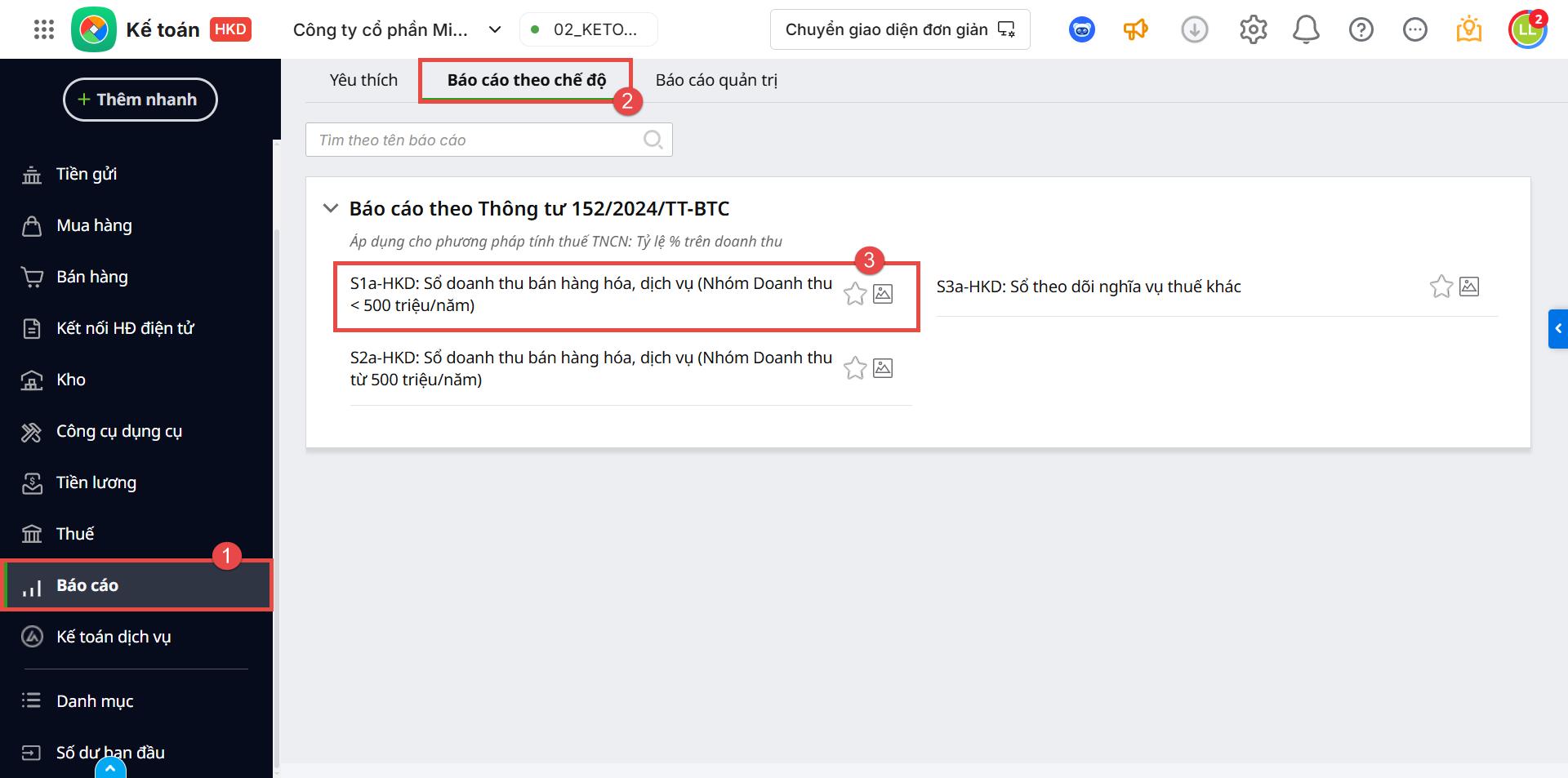 2.2. Xem báo cáoĐể xem sổ S1a-HKD: Sổ doanh thu bán hàng hóa, dịch vụ (Nhóm Doanh thu ≤ 500 triệu/năm), anh/chị thực hiện như sau: Bước 1: Vào Báo cáo\Báo cáo theo chế độ, chọn sổ S1a-HKD: Sổ doanh thu bán hàng hóa, dịch vụ (Nhóm Doanh thu ≤ 500 triệu/năm)