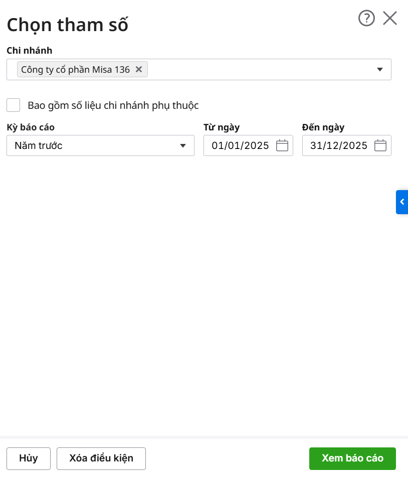 Bước 2: Thiết lập các tham số báo cáo.