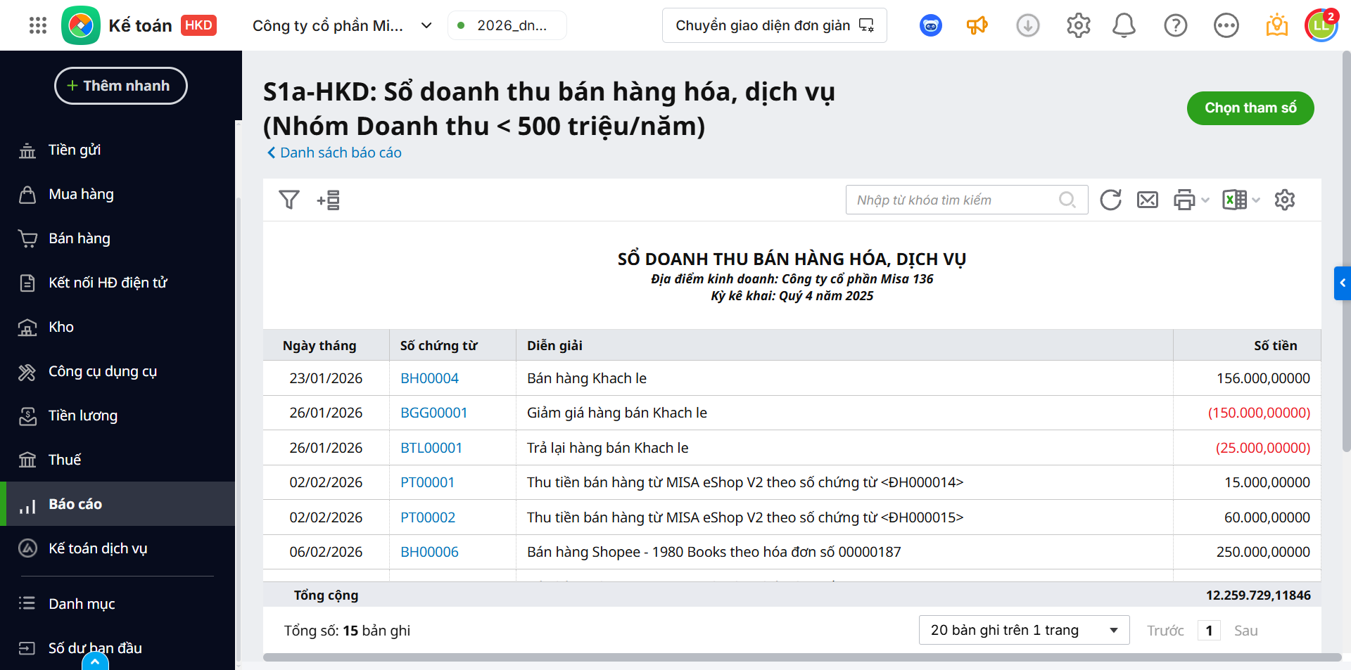 2.1. Cách lấy số liệu lên báo cáoSổ S1a-HKD: Sổ doanh thu bán hàng hóa, dịch vụ nhằm mục đích ghi chép doanh thu bán hàng, dịch vụ thực tế phát sinh giúp hộ kinh doanh dễ dàng quản lý và theo dõi. Dữ liệu trên sổ được hệ thống tự động tổng hợp từ các chứng từ có ngày hạch toán trong kỳ: