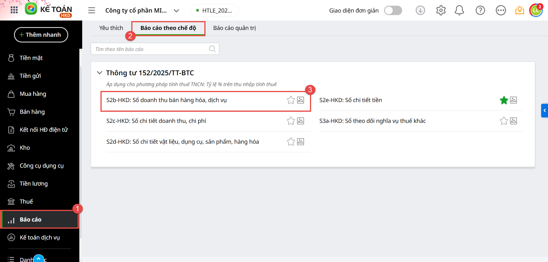 Lưu ý: Thuế GTGT trên sổ S2b-HKD đã được giảm 20% theo nghị định. 2.2. Xem báo cáoĐể xem sổ S2b-HKD: Sổ doanh thu bán hàng hóa, dịch vụ, anh/chị thực hiện như sau: Bước 1: Vào Báo cáo\Báo cáo theo chế độ, chọn sổ S2b-HKD: Sổ doanh thu bán hàng hóa, dịch vụ: