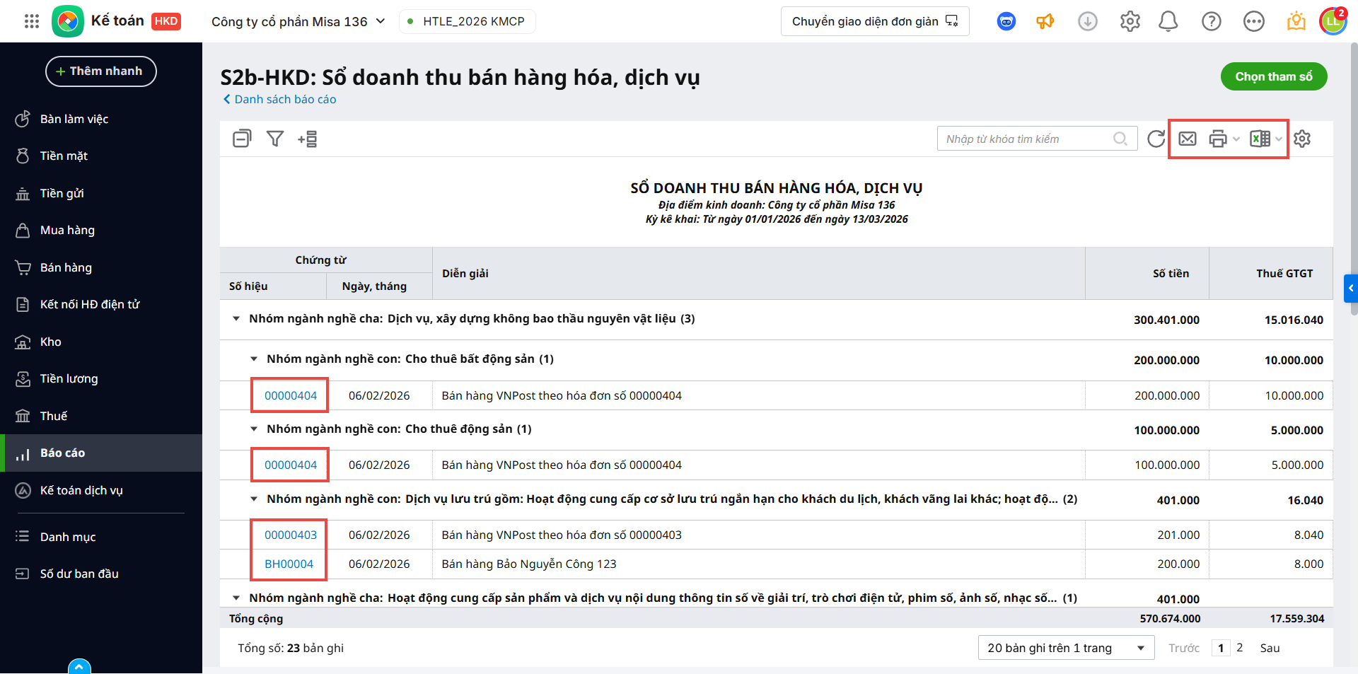 2.1. Cách lấy số liệu lên báo cáoSổ S2b-HKD: Sổ doanh thu bán hàng hóa, dịch vụ nhằm mục đích theo dõi và ghi chép chi tiết doanh thu từ hoạt động bán hàng, cung cấp dịch vụ theo từng nhóm ngành nghề kinh doanh, từ đó làm căn cứ cho hộ kinh doanh, cá nhân kinh doanh và cơ quan thuế xác định nghĩa vụ thuế GTGT đối với ngân sách nhà nước theo quy định của pháp luật về thuế. Doanh thu trên báo cáo S2b-HKD là doanh thu các chứng từ bán hàng, giảm giá hàng bán, trả lại hàng bán (loại bán hàng hóa, dịch vụ) có ngày hạch toán trong kỳ và có chọn Nhóm ngành nghề. Lưu ý: Đối với chứng từ được chọn Giảm 20% thuế GTGT theo quy định thì số liệu Thuế GTGT đã được tính toán chính xác sau khi trừ Tiền thuế GTGT giảm trừ. 2.2. Xem báo cáoĐể xem sổ S2b-HKD: Sổ doanh thu bán hàng hóa, dịch vụ, anh/chị thực hiện như sau: Bước 1: Vào Báo cáo\Báo cáo theo chế độ, chọn sổ S2b-HKD: Sổ doanh thu bán hàng hóa, dịch vụ: