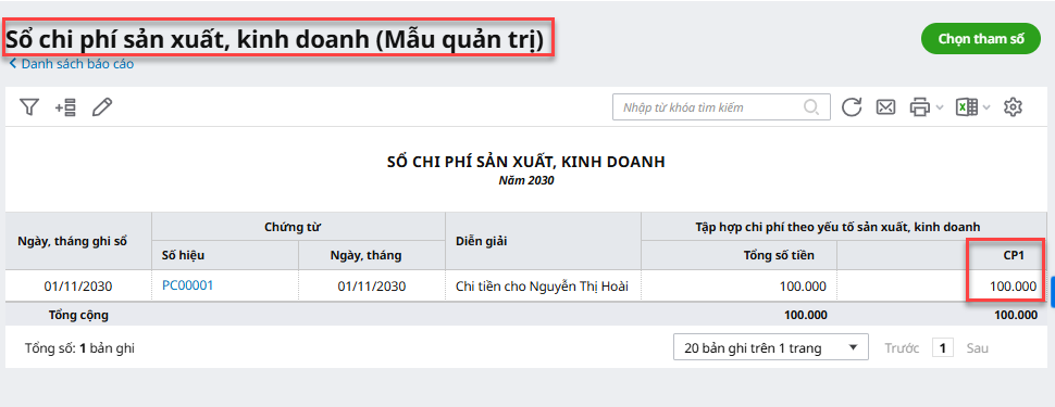 Lưu ý: Với cái chứng từ hạch toán chọn khoản mục chi phí không thuộc 7 loại theo quy định của thông tư thì sẽ không lên báo cáo này, anh/chị kiểm tra bằng cách vào phân hệ Báo cáo\Báo cáo quản trị\Khác chọn báo cáo Sổ chi phí sản xuất, kinh doanh (Mẫu quản trị) để xem phát sinh chi tiết từng loại khoản mục chi phí và sửa lại cho chính xác.