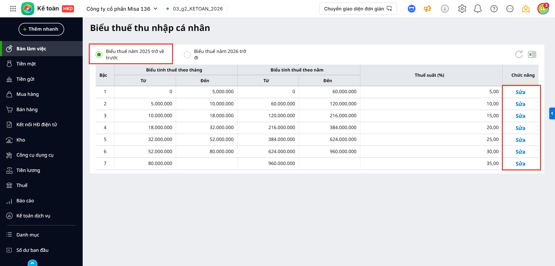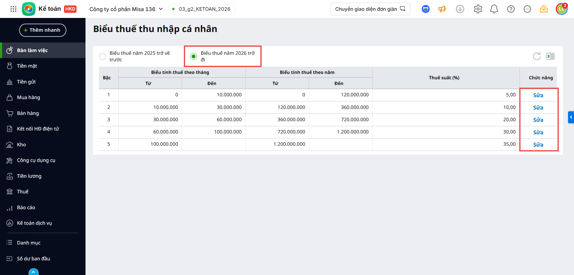 Từ ngày 01/01/2026, hệ thống cập nhật biểu thuế TNCN mới theo Luật thuế TNCN năm 2025. Tùy thuộc vào kỳ tính lương, hệ thống sẽ áp dụng biểu thuế TNCN khác nhau: