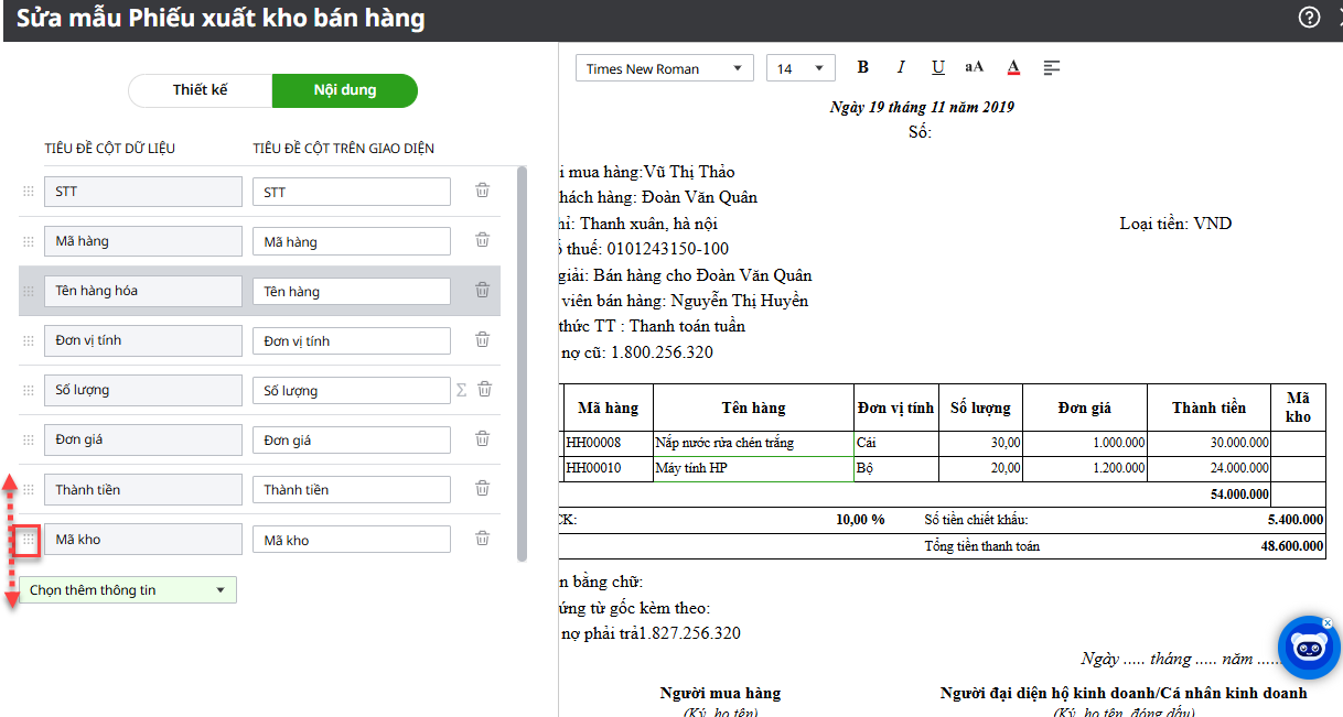 2.2. Thay đổi vị trí thông tin hiển thị trên chứng từVí dụ: Thay đổi vị trí dòng Tên khách hàng lên trên dòng Người mua hàng.