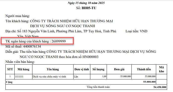 2.4. Thêm trường dữ liệu có sẵn trên hệ thốngVí dụ: Thêm dòng Số tài khoản ngân hàng người mua