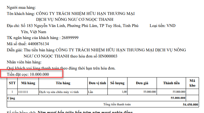 2.6. Thêm trường mở rộngVí dụ: Trên giao diện nhập liệu, đơn vị đã bổ sung Trường mở rộng 1 tên Tiền đặt cọc và muốn hiển thị lên chứng từ