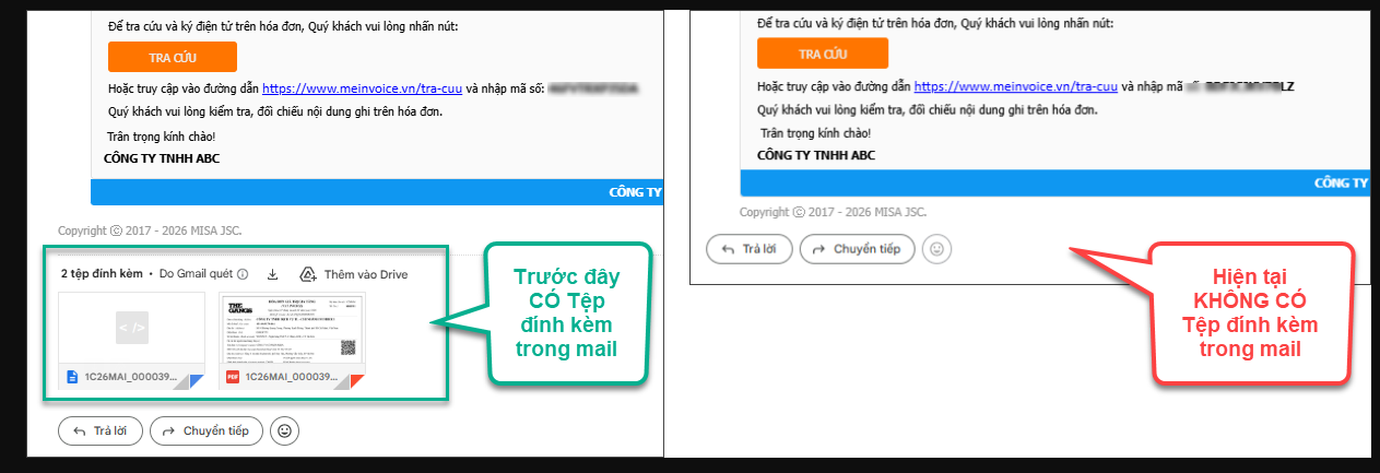 Biểu hiện cụ thể: Khi gửi email hóa đơn đã phát hành cho người mua thì lúc kiểm tra mail không thấy phần mềm tự động đính kèm file PDF và XML của hóa đơn như lúc trước nữa.