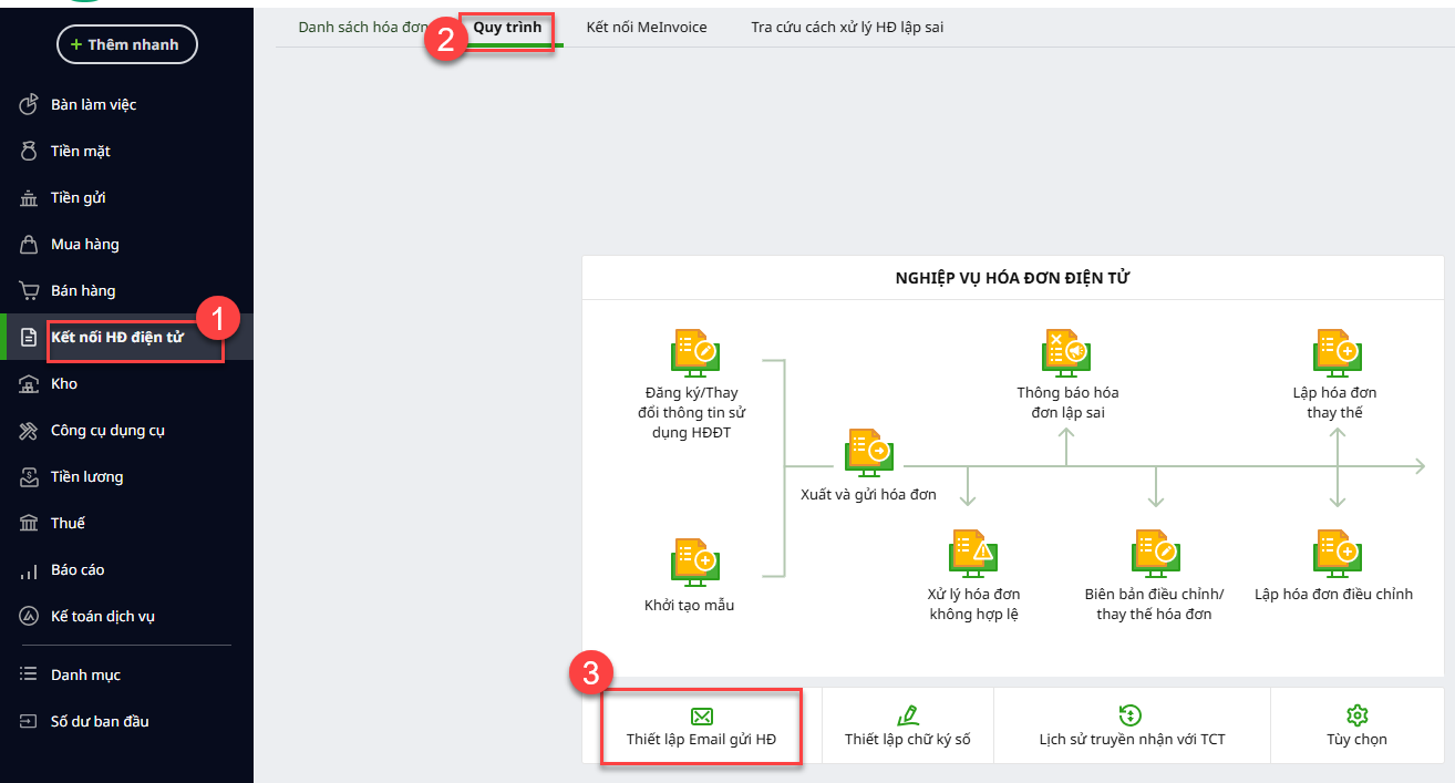 Bước 1: Nhấn chữ Tại đây ngay trên thông báo hoặc vào phân hệ Kết nối HĐ điện tử, chọn tab Quy trình\Thiết lập Email gửi HĐ