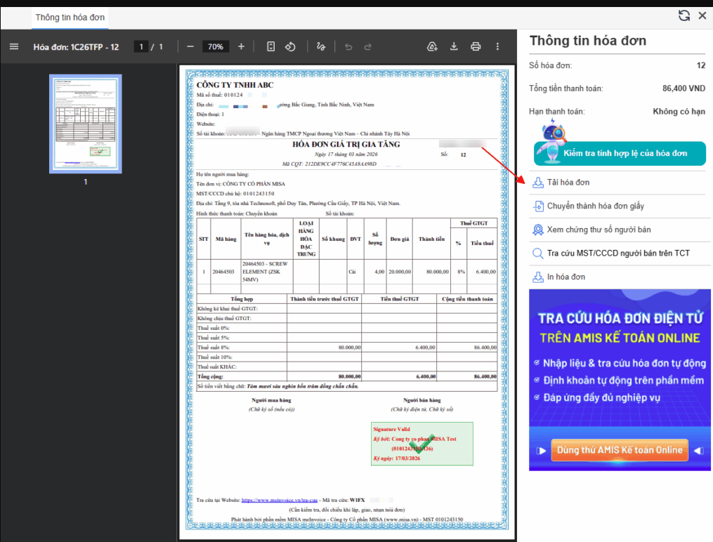 Bước 2. Giao diện tự động mở trang tra cứu hóa đơn của MEINVOICE và hiển thị sẵn nội dung của hóa đơn đó.