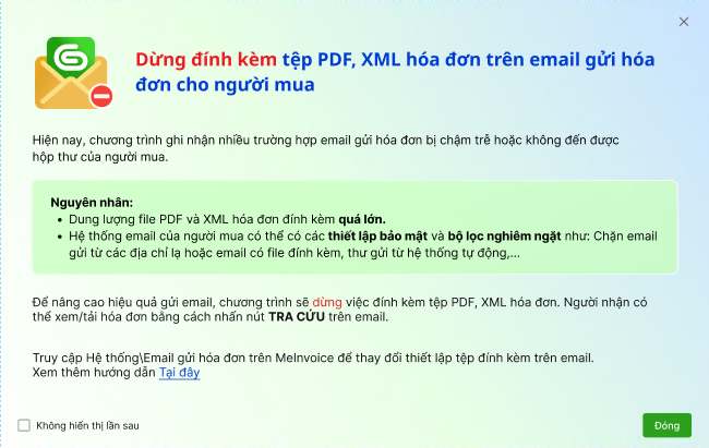 Hiện nay, nhiều khách hàng bị chậm trễ hoặc không nhận được email kèm hóa đơn đến hộp thư do dung lượng file đính kèm quá lớn cũng như các thiết lập bảo mật liên quan. Phần mềm meInvoice đã cải tiến nâng cao hiệu quả gửi hóa đơn cho người dùng bằng cách cho phép thiết lập không đính kèm file hóa đơn.