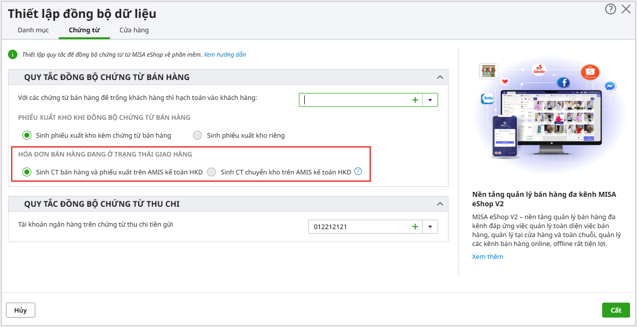 Sau khi thực hiện kết nối phần mềm AMIS Kế toán HKD với MISA eshop V2, anh/chị cần thiết lập đồng bộ dữ liệu, cụ thể như sau: