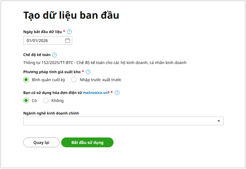 - Thiết lập các thông tin của dữ liệu kế toán như: Phương pháp tính giá xuất kho, Có sử dụng hóa đơn điện tử meInvoice hay không.