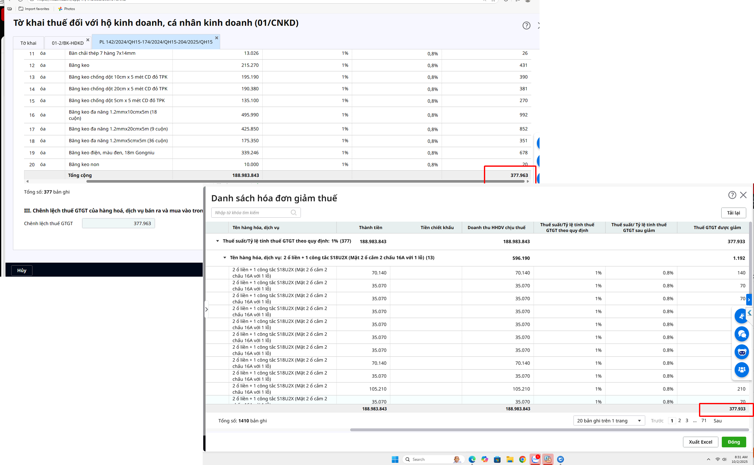 Ví dụ: Thuế GTGT được giảm (cột 6) trên phụ lục PL142/2024/QH15 là 377.963 không khớp với cột Thuế GTGT được giảm trên danh sách hóa đơn giảm thuế là 377.933.