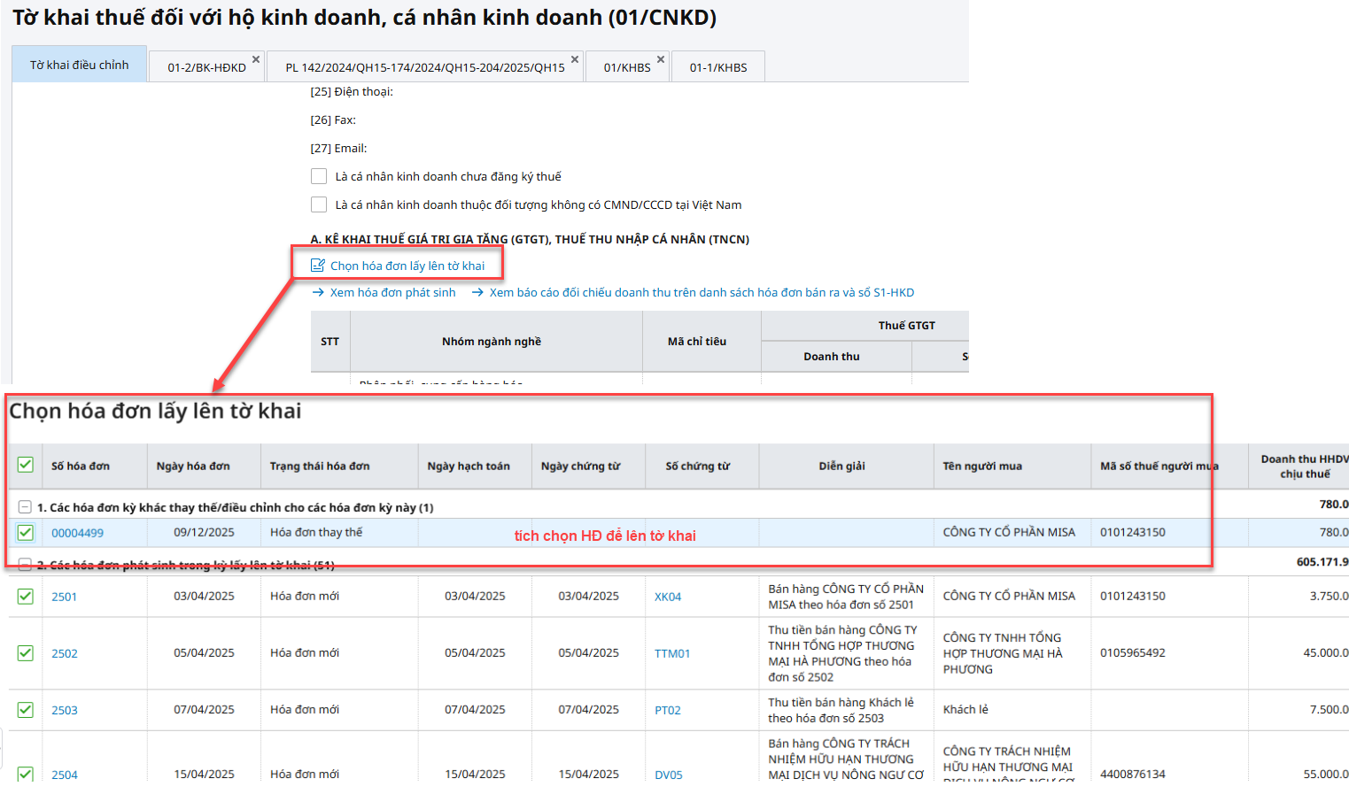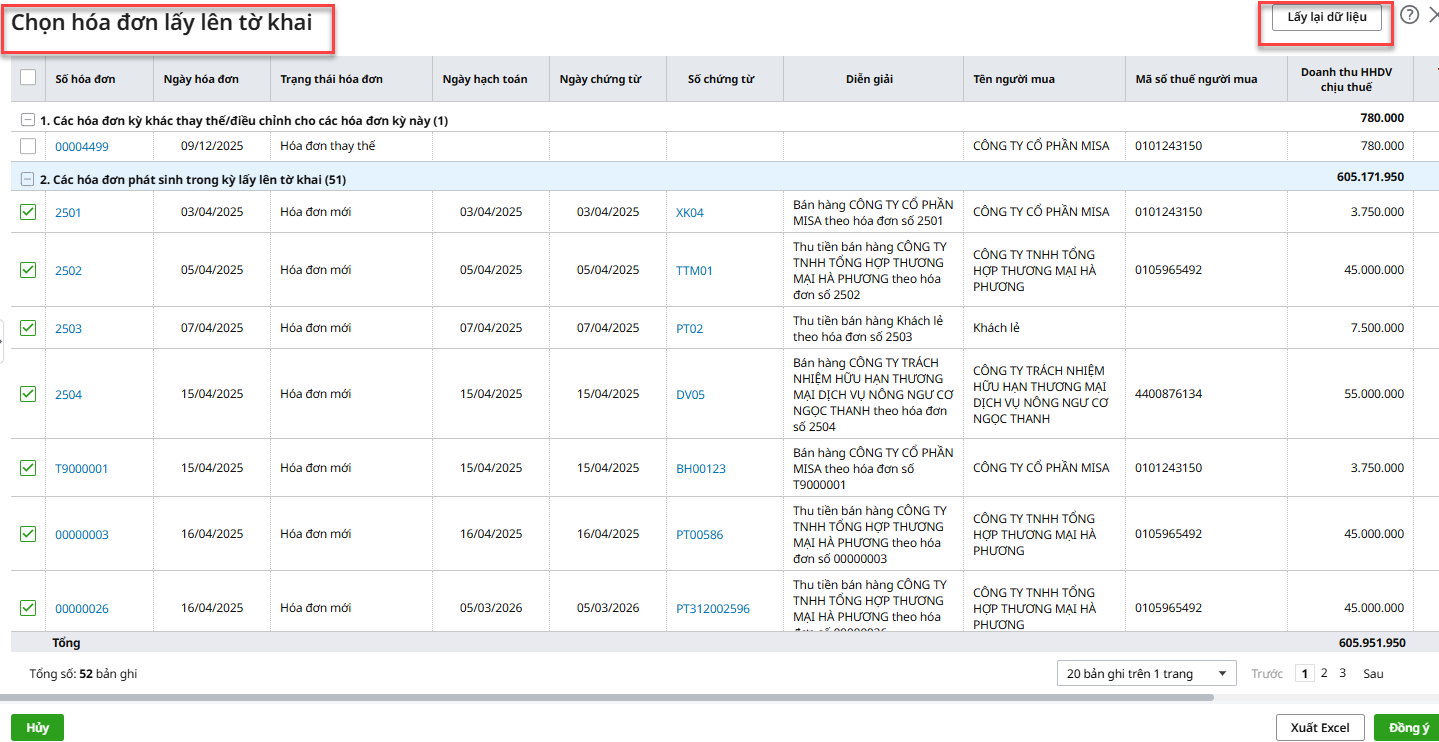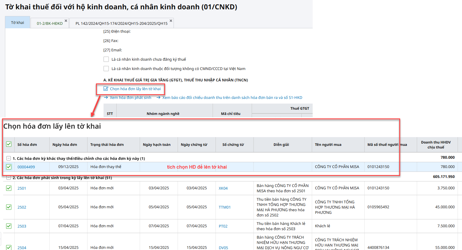 Ví dụ: Ngày 09/12/2025, xuất hóa đơn số 00004499 thay thế cho hóa đơn số 00000053 ngày 24/06/2025. Khi lập tờ khai thuế quý 2/2025 lần đầu, anh/chị nhấn Chọn hóa đơn lấy lên tờ khai và tích chọn hóa đơn số 00004499 lên tờ khai.