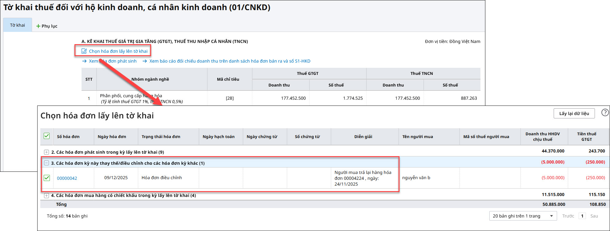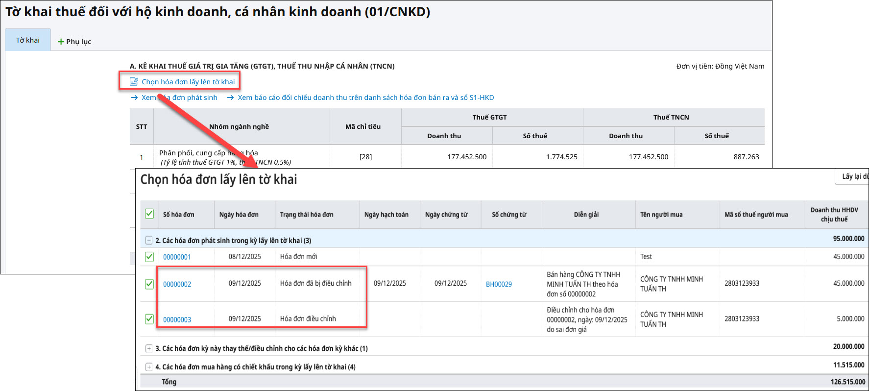 Ví dụ: Ngày 09/12/2025, đơn vị xuất hóa đơn số 00000003 điều chỉnh cho hóa đơn số 00000002 ngày 09/12/2025. Khi lập tờ khai thuế tháng 12/2025 lần đầu hóa đơn số 00000002 và hóa đơn số 00000003 sẽ tự tổng hợp số liệu lên tờ khai.