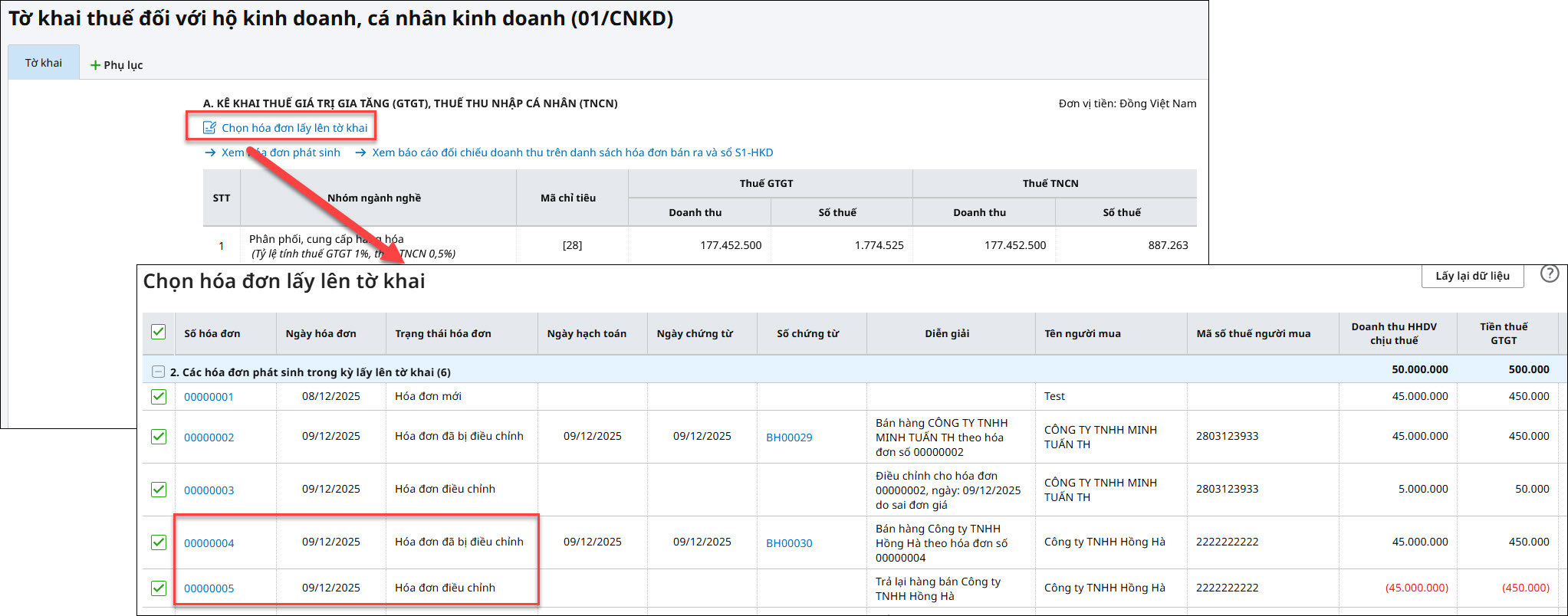 Ví dụ: Ngày 09/12/2025, đơn vị xuất hóa đơn số 00000005 điều chỉnh giảm cho hóa đơn số 00000004 ngày 09/12/2025 do người mua trả lại hàng. Khi lập tờ khai thuế tháng 12/2025 lần đầu hóa đơn hóa đơn số 00000004 và số 00000005 sẽ tự tổng hợp số liệu lên tờ khai.