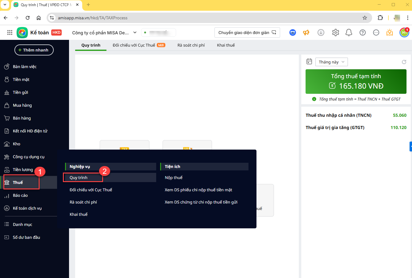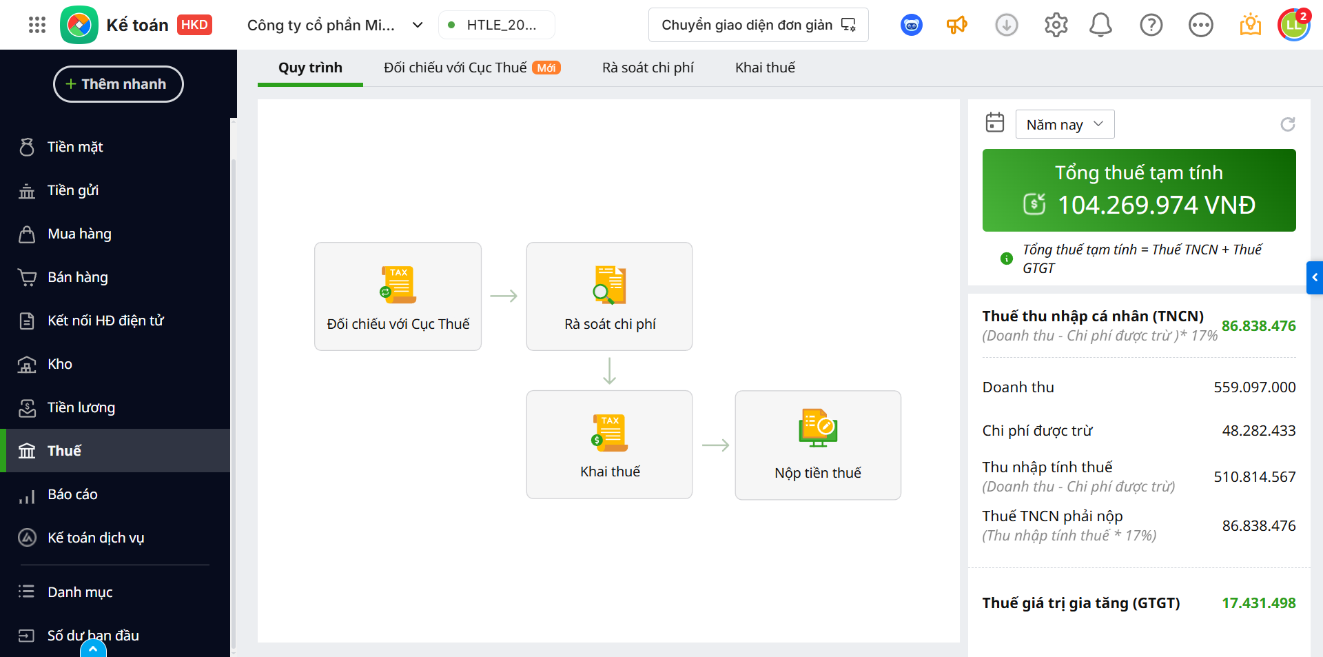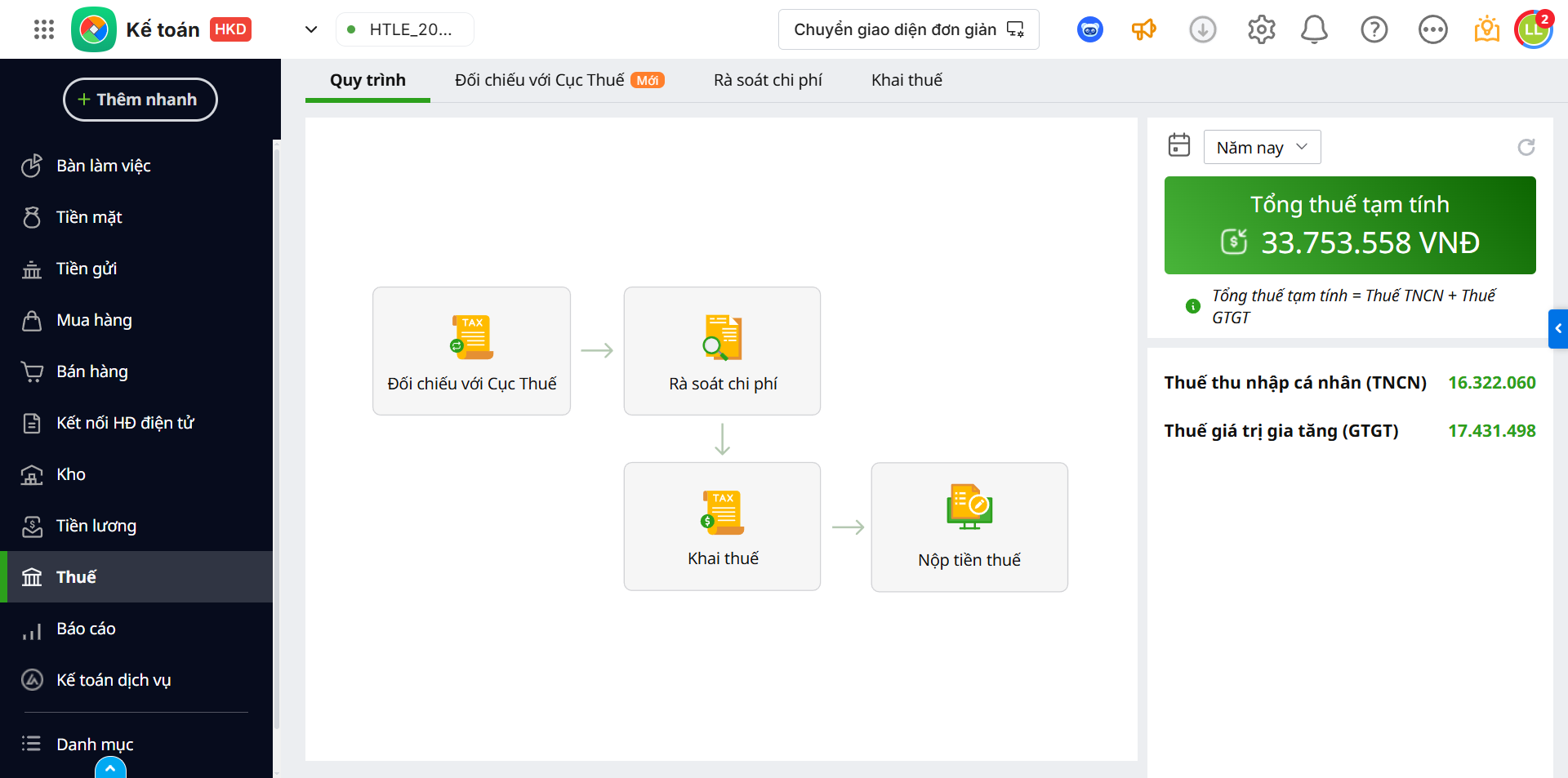 Bước 1: Vào phân hệ Thuế\Quy trình, mục Tổng thuế tạm tính sẽ được hiển thị ở phía bên phải màn hình.