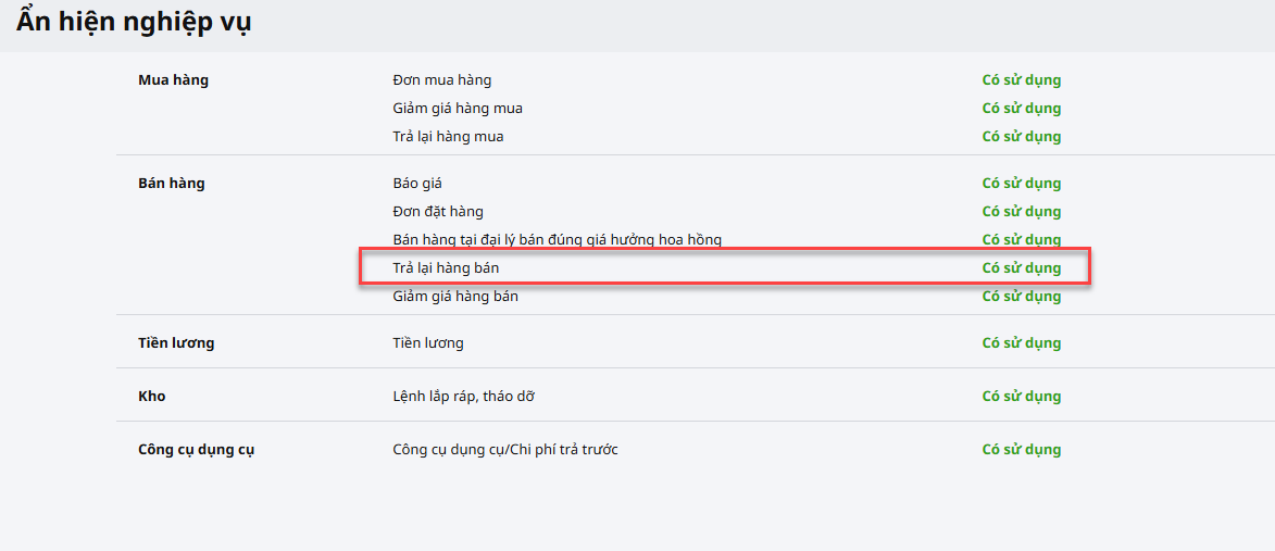 Lưu ý: Để hiển thị tab Trả lại hàng bán trên phân hệ Bán hàng, anh/chị cần tích chọn Có sử dụng nghiệp vụ Trả lại hàng bán trên Các tiện ích và Thiết lập/ Tùy chọn/ Ẩn hiện nghiệp vụ.