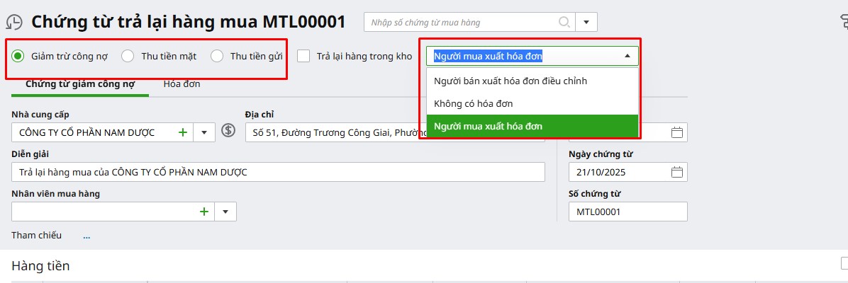 Bước 3: Hoàn thiện thông tin chứng từ Trả lại hàng mua.