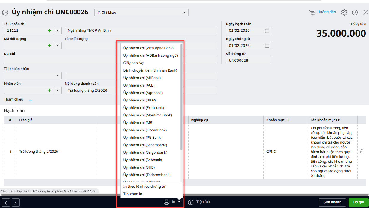 Bước 4: Phần mềm tự động sinh ra chứng từ Ủy nhiệm chi trả lương nhân viên. Kiểm tra chứng từ chi tiền gửi và chọn tài khoản ngân hàng chi tiền. Nhấn Cất.