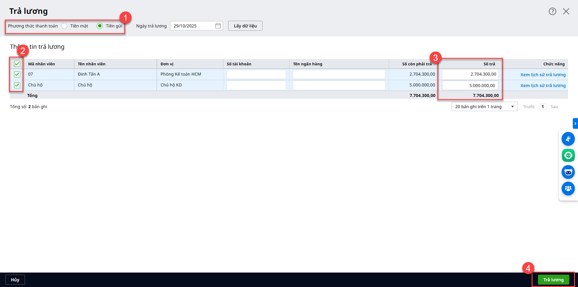 Để thực hiện nghiệp vụ trả lương cho nhân viên, anh/chị thực hiện theo các bước sau: