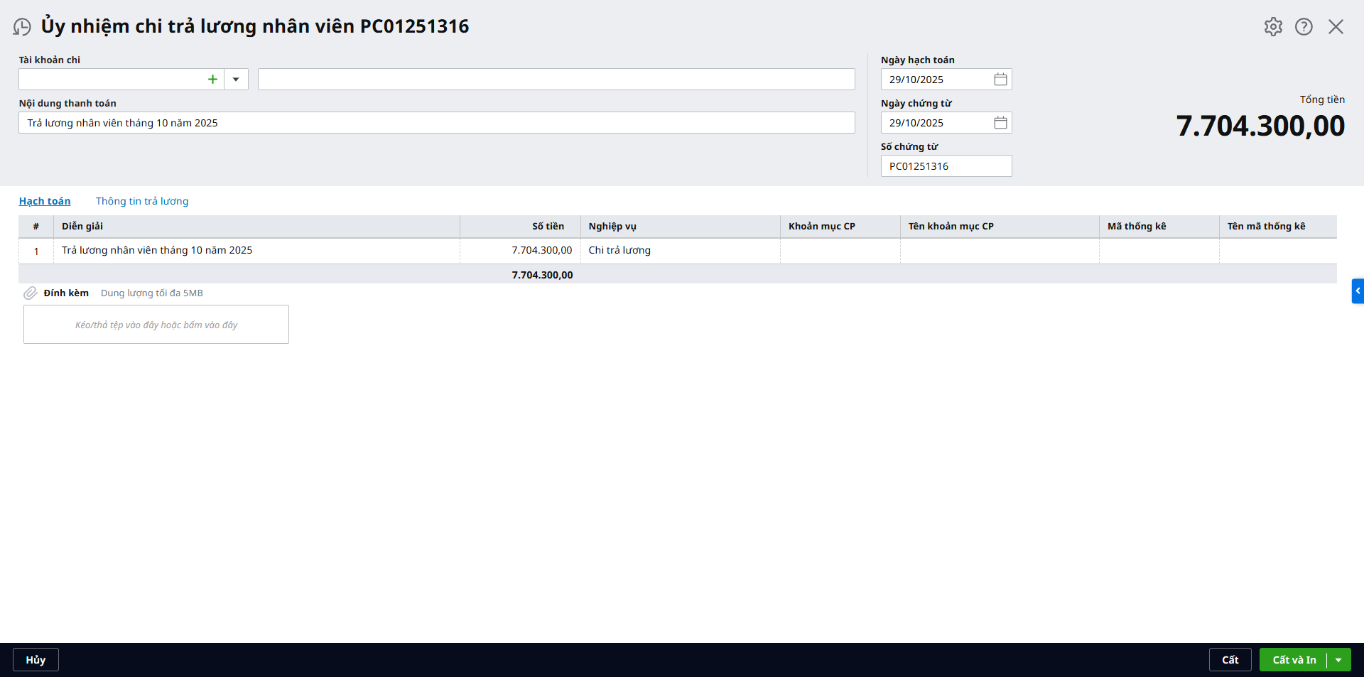 Bước 3: Tùy theo phương thức thanh toán, chương trình sẽ tự động sinh ra Phiếu chi trả lương nhân viên hoặc Ủy nhiệm chi trả lương nhân viên. Kiểm tra lại thông tin trên chứng từ rồi nhấn Cất.