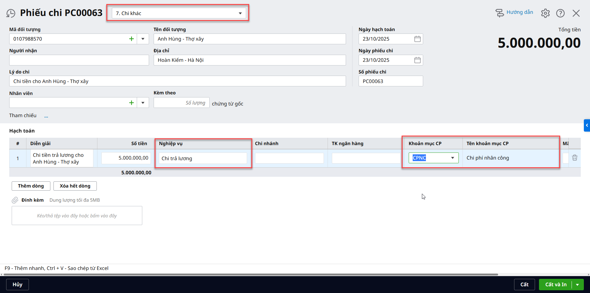 Bước 2: Chọn loại phiếu chi là Chi khác. Bước 3: Khai báo thông tin chứng từ
