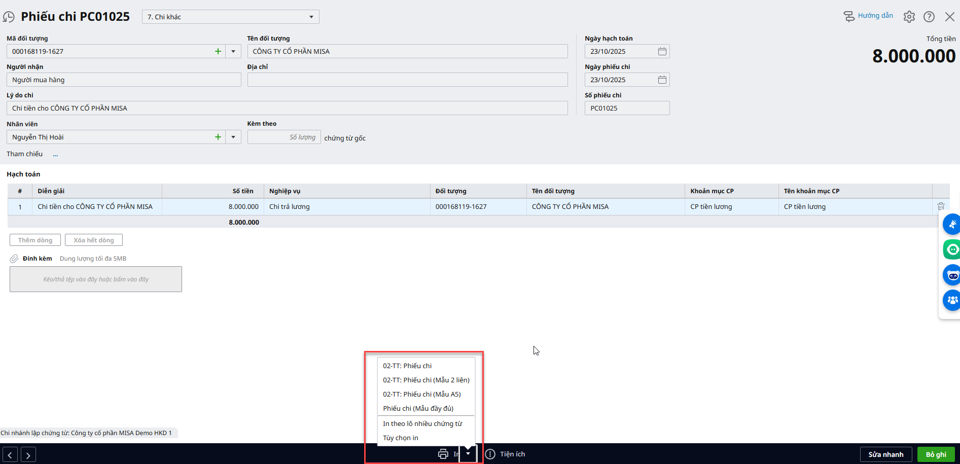 Bước 5: Chọn biểu tượng mũi tên (▼) cạnh nút In, sau đó chọn mẫu chứng từ cần in.