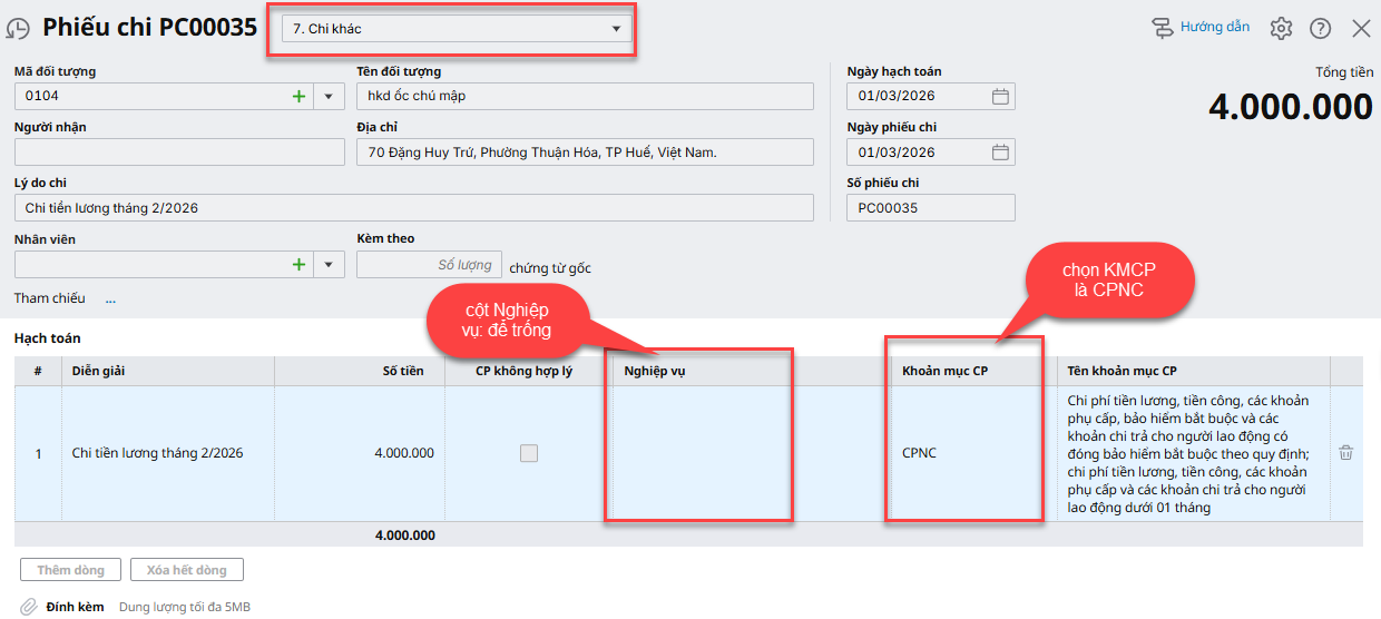 Bước 2: Chọn loại phiếu chi là Chi khác.