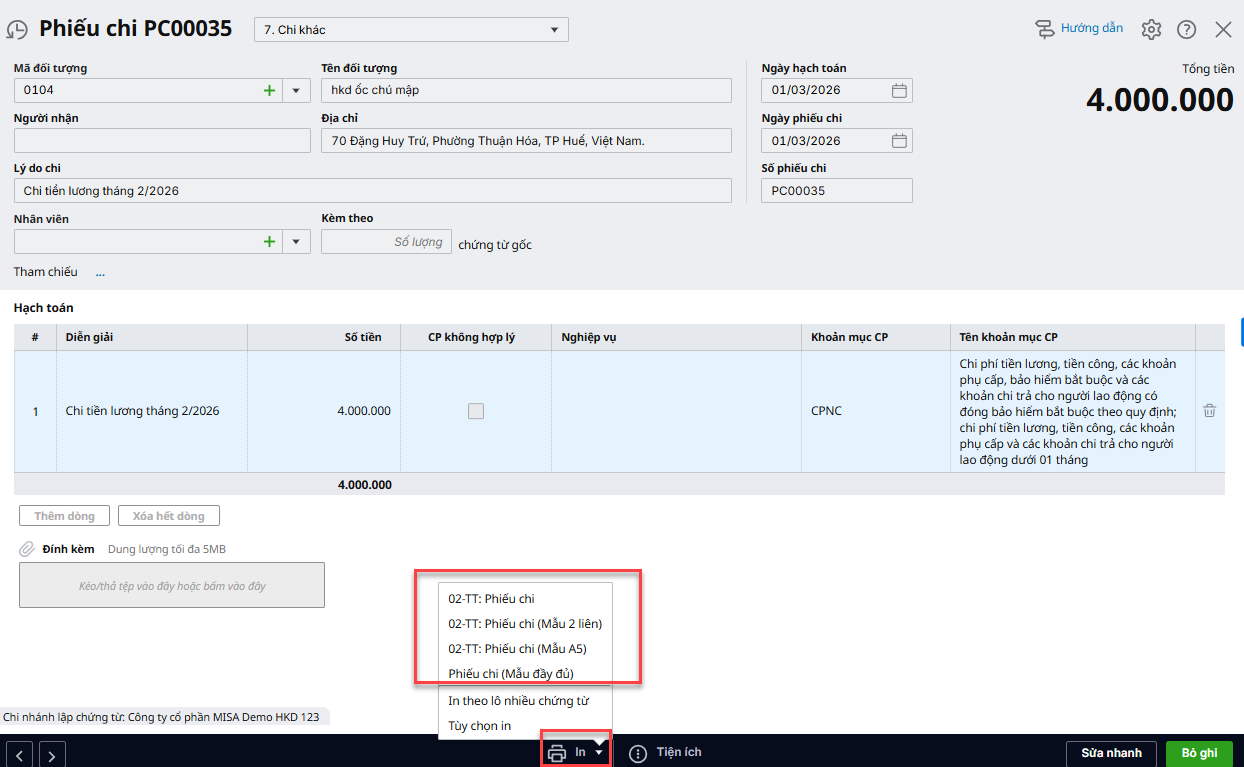 Bước 5: Chọn biểu tượng mũi tên (▼) cạnh nút In, sau đó chọn mẫu chứng từ cần in.