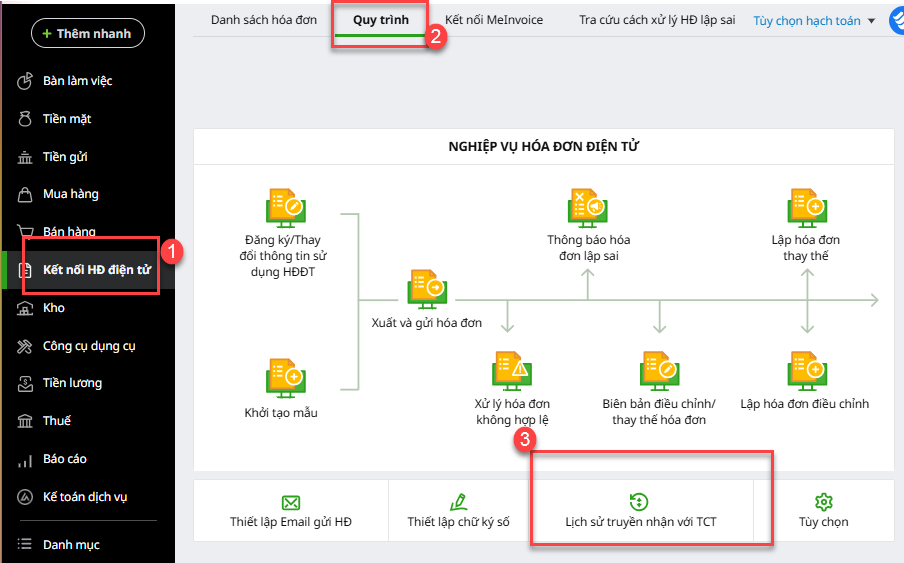 2.1. Kiểm tra lý do Hóa đơn không hợp lệĐể xem lý do hóa đơn không hợp lệ, anh/chị thực hiện theo các bước sau: Bước 1: Vào phân hệ Kết nối HĐ điện tử/ tab Quy trình, chọn Lịch sử truyền nhận với TCT.