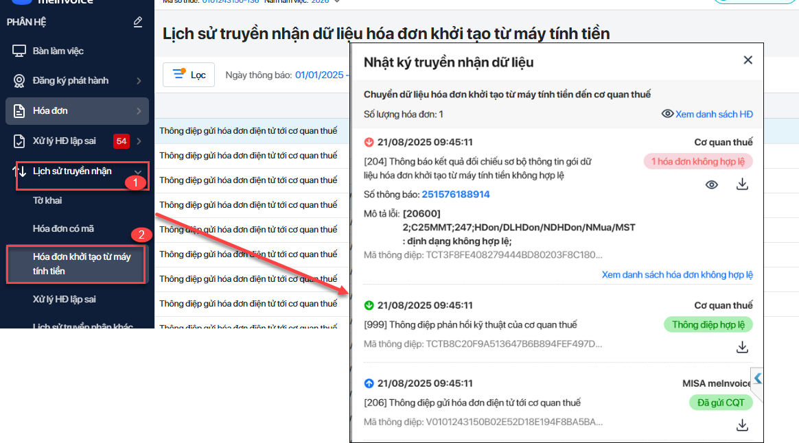 Chương trình sẽ tự động điều hướng sang phần mềm MISA meInvoice. Bước 2: Vào phần Lịch sử truyền nhận\ Hóa đơn khởi tạo từ máy tính tiền, tại cột Trạng thái dòng có thông tin Hóa đơn không hợp lệ, nhấn biểu tượng mắt Xem nhật ký để kiểm tra lý do: