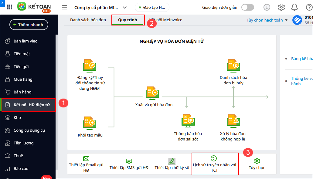 2.1.2. Xử lý hóa đơn từ chối cấp mã, không hợp lệ trên phần mềm Amis kế toán Bước 1: Vào phân hệ Kết nối HĐ điện tử/tab Quy trình, chọn chức năng Xử lý hóa đơn không hợp lệ Bước 2: Tại giao diện xử lý hóa đơn không hợp lệ, nhấn Thêm Bước 3: Thực hiện thiết lập điều kiện để tìm kiếm các hóa đơn không hợp lệ như sau: